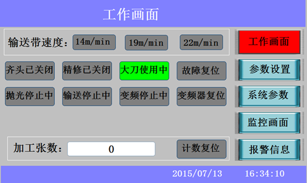 利用感應(yīng)器檢知工件工位從而完成封邊機(jī)的輸送-->涂膠-->切斷-->前后齊頭-->上下修邊-->上下精修 -->上下刮邊-->拋光等封邊工序。系統(tǒng)觸摸屏則提供一個人機(jī)交流界面 ,讓整個工序流程一目了然,對于外圍電路的故障也可做到可視化。變頻器與PLC通過MODBUS通訊,方便客戶根據(jù)不同產(chǎn)品調(diào)整線體速度。