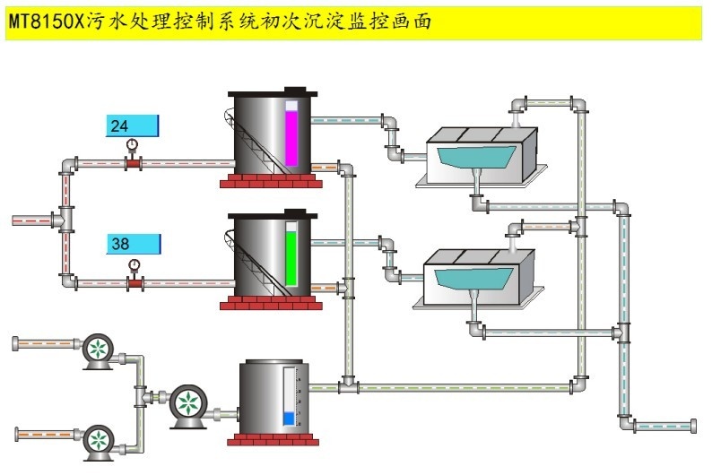 觸摸屏主畫面可以直觀的監(jiān)視整個污水處理系統(tǒng)各個環(huán)節(jié)的工作情況,并能對各個水泵房的電機、參數(shù)進行控制和監(jiān)控,如果參數(shù)有超出范圍的必須發(fā)出報警提示,對于液位,流量等重要參數(shù)能以曲線形象顯示,并存儲為報表。下面是威綸通MT8150X人機觸摸屏處理污水監(jiān)控過程: