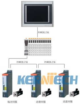 功能描述:該系統(tǒng)采用貝加萊PP400作為主控制器,下掛I/O及伺服。端封伺服通過電子凸輪跟隨虛擬主軸完成周期性的封切動(dòng)作;送膜伺服跟隨虛擬主軸并根據(jù)色標(biāo)的檢測(cè)信號(hào)進(jìn)行實(shí)時(shí)跟蹤調(diào)整,以保證端封切在膜上的位置;送面伺服跟隨虛擬主軸并根據(jù)推面桿的檢測(cè)信號(hào)進(jìn)行跟蹤調(diào)整,以保證面在包裝膜內(nèi)的位置,避免鍘包。
