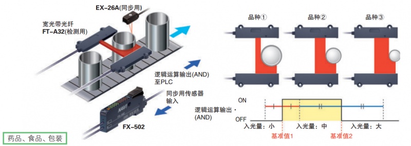 通過(guò)使用寬光帶光纖,可根據(jù)容器尺寸的不同獲得入光量的差,從而實(shí)現(xiàn)穩(wěn)定檢測(cè)。另外,利用FX-502的 外部輸入及邏輯運(yùn)算輸出,并通過(guò)比較進(jìn)行判別,從而實(shí)現(xiàn)了利用比以往更少的傳感器臺(tái)數(shù)及I/O點(diǎn)數(shù)來(lái)進(jìn) 行品種判別,有助于降低綜合成本。