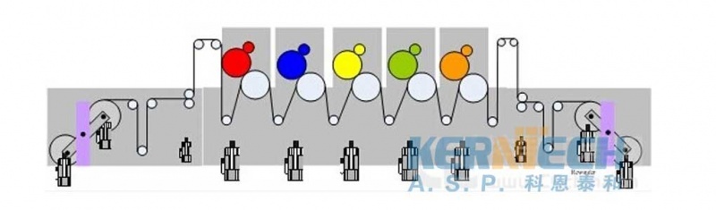 印刷機(jī)是整個(gè)柔版印刷技術(shù)的關(guān)鍵,包括開卷,印刷,干燥和收卷等四部分,開卷主要是完成筒紙?jiān)谝欢ㄋ俣群蛷埩Φ臈l件下展開,并保持相對(duì)穩(wěn)定的狀態(tài)。每一印刷機(jī)組,都由印版滾筒、壓印滾筒、供墨系統(tǒng)組成。干燥設(shè)備按照印刷產(chǎn)品及使用的油墨,可分別選用紅外線、紫外線干燥單元,亦可選用紫外線和紅外線混合型干燥單元,還可以采用冷或熱吹送系統(tǒng)對(duì)印張進(jìn)行干燥。收卷部分即復(fù)卷部分,是在普通的軸承上裝有一根軸,通過(guò)鐵心夾盤固定住卷紙輥,復(fù)卷印刷后的印張。系統(tǒng)簡(jiǎn)圖如下: