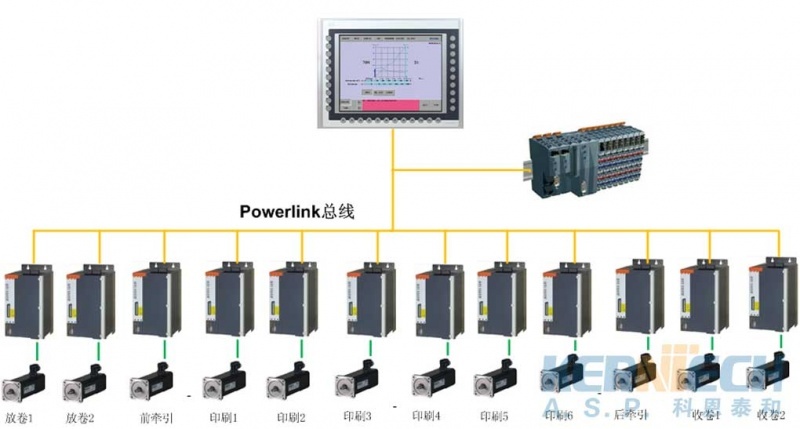 貝加萊集成套色的優(yōu)點(diǎn),對(duì)于印刷系統(tǒng)而言關(guān)鍵在于套色的套印精度,采用貝加萊PCC控制,具有高級(jí)語(yǔ)言編程能力,可以借助多種開發(fā)好的庫(kù)函數(shù)。ACOPOS是一個(gè)模塊化的驅(qū)動(dòng)系統(tǒng),它具有智能化的特點(diǎn),色標(biāo)傳感器可以直接接入驅(qū)動(dòng)器,在驅(qū)動(dòng)器內(nèi)部實(shí)現(xiàn)采樣,濾波,處理,編碼和通信封裝,直接進(jìn)行驅(qū)動(dòng)器的位置調(diào)整,比傳統(tǒng)方式節(jié)省了數(shù)據(jù)傳送環(huán)節(jié),很容易達(dá)到多軸同步控制。同時(shí)具有的虛擬主軸技術(shù),不存在磨損,跳動(dòng),偏差,其他軸緊隨虛擬軸運(yùn)動(dòng),大大減少了誤差。支持Powerlink總線技術(shù),通信速度100M,網(wǎng)絡(luò)周期最短400微秒,保證了系統(tǒng)的高速響應(yīng)。