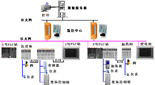 污水處理的工藝流程大體分為:格柵處理、泵房提升、沉砂處理、一次沉淀池、曝氣池處理、二次沉淀池處理、泥漿制備、昭氣利用。需要控制的區(qū)域主要有進(jìn)水泵房,鼓風(fēng)機(jī)房,脫水機(jī)房,變電所,加藥間等區(qū)域。有柵格、總泵房、沉砂池、生物反應(yīng)池、沉淀池、加氯間、污泥處理裝置、變電站等控制對(duì)象。