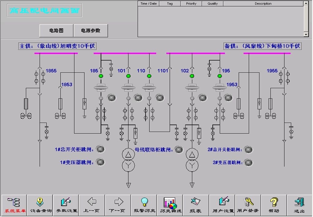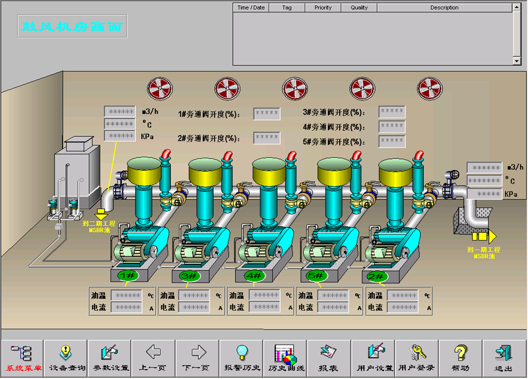 在鼓風(fēng)機(jī)房,系統(tǒng)需要控制鼓風(fēng)機(jī)組的開關(guān)機(jī)順序,檢測鼓風(fēng)機(jī)組的故障報(bào)警,根據(jù)生化池中溶氧的濃度調(diào)節(jié)出風(fēng)閥開啟度,檢測生化池等相關(guān)儀表的參數(shù)。在脫水機(jī)房系統(tǒng)需要采集脫水機(jī)房、污泥池內(nèi)電氣設(shè)備運(yùn)行工況及附近的儀表參數(shù)并對(duì)相應(yīng)電氣設(shè)備進(jìn)行控。在變電所需要采集鼓風(fēng)機(jī)房高壓變配電所設(shè)備的運(yùn)行工況及對(duì)附近電氣設(shè)備進(jìn)行控制等。具有現(xiàn)場設(shè)備查詢,故障記錄及報(bào)警,各項(xiàng)數(shù)據(jù)曲線等功能。