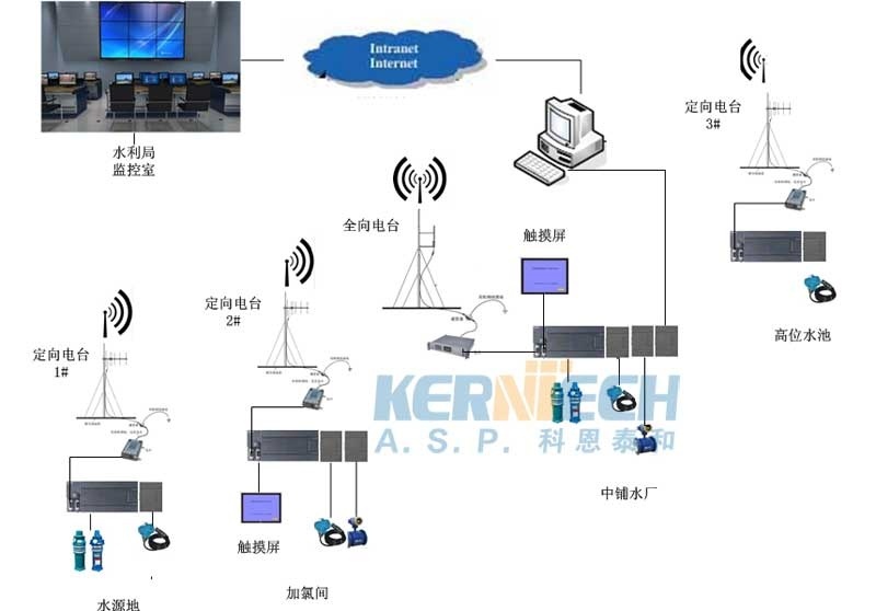 現(xiàn)場四部分均相距3公里以上,考慮經(jīng)濟的投資成本采用了無線數(shù)傳電臺的方式進行通訊,節(jié)省布線的成本,降低了施工的難度。