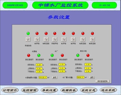 水廠有800 立方米蓄水池一個, 液位計一套,液位計檢測水廠水位,當(dāng)水廠水位低時,及時給水源地水泵啟動信號。啟動水源地水泵上水,同時水廠有55KW電機兩臺,帶動兩臺水泵,向高位水池供水,流量計一個,用于檢測水廠水泵的流量,壓力表一個,用于檢測水源地的水泵壓力,通過流量和壓力的檢測能很好的檢測水泵的工作狀態(tài)。