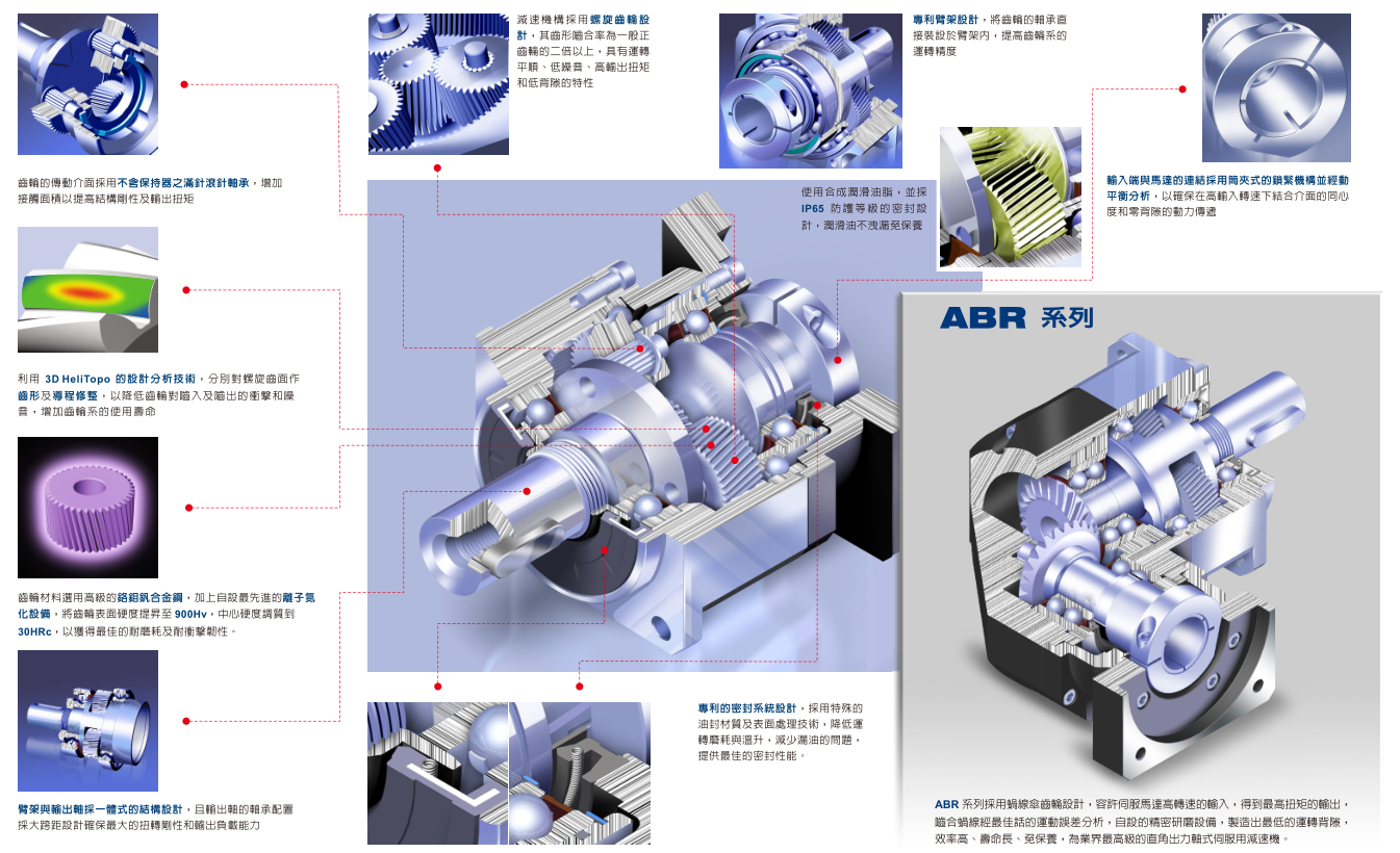 螺旋齒輪設(shè)計(jì);筒夾式的鎖緊機(jī)構(gòu);馬達(dá)連接板的模組化設(shè)計(jì);一體式的齒輪箱本體;NyoGel 792D 合成潤(rùn)滑油脂;一體式的臂架;先進(jìn)的離子氮化技術(shù);3D拓蹼的設(shè)計(jì)分析技術(shù);滿針的滾針軸承設(shè)計(jì)。
