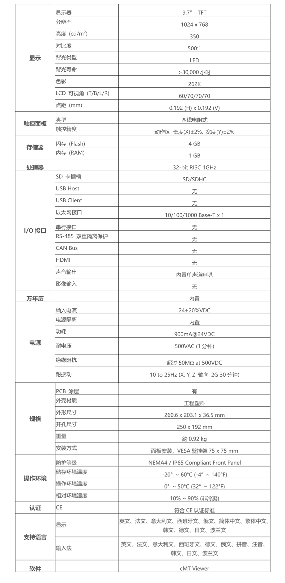人機界面(HMI)-cMT Series cMT-iV6,9.7" 1024 x 768 TFT LCD,無風扇冷卻系統(tǒng)。
